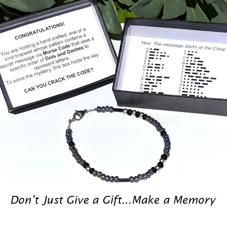 Lift the cotton padding, and beneath it lies the Morse code guide revealing how to decode the bracelet’s hidden message, like solving a puzzle. What starts as a beautiful bracelet becomes a meaningful moment of discovery.